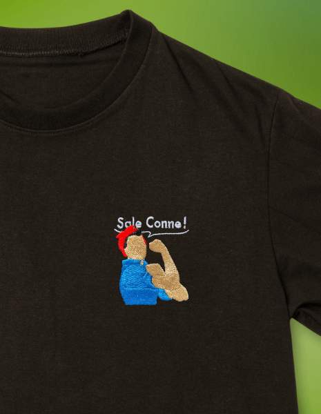 En plus de ces 3 best-sellers, nous produisons également beaucoup d’habits LGBT+ personnalisés car il y a aussi une forte demande. Concrètement : tu peux choisir les fringues que tu veux, le mot ou l’expression que tu souhaites, et nous brodons cela aux couleurs de l’arc-en-ciel.