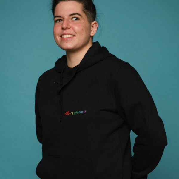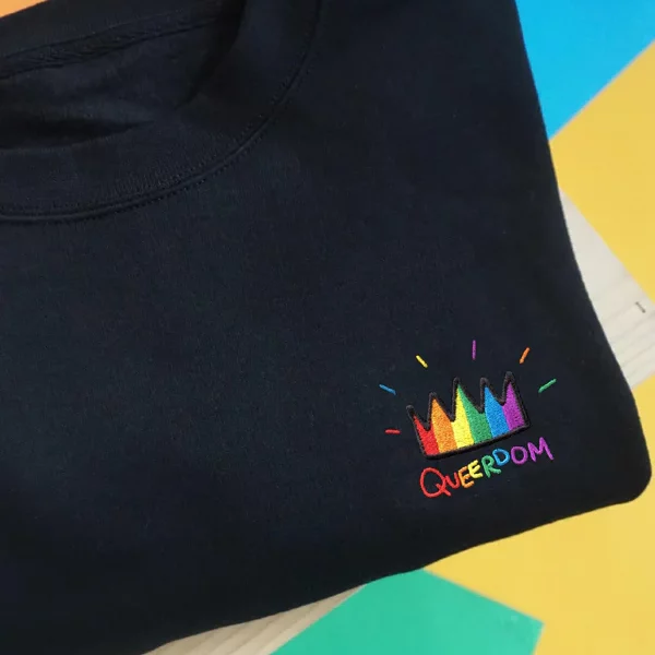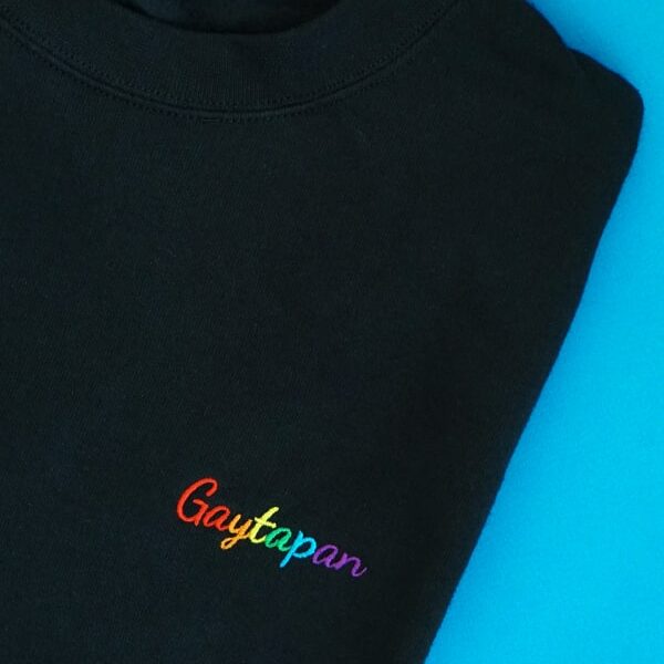 En plus de ces 3 best-sellers, nous produisons également beaucoup d’habits LGBT+ personnalisés car il y a aussi une forte demande. Concrètement : tu peux choisir les fringues que tu veux, le mot ou l’expression que tu souhaites, et nous brodons cela aux couleurs de l’arc-en-ciel.