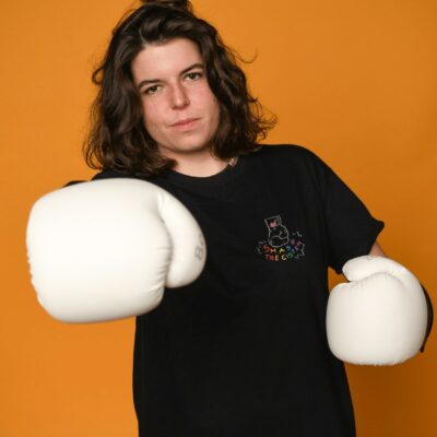 Description du cadeau > T-shirt LGBT+ blanc brodé Queer d’Artichaut > 100% Coton Biologique GOTS > Taille au choix (du XS au 3XL)