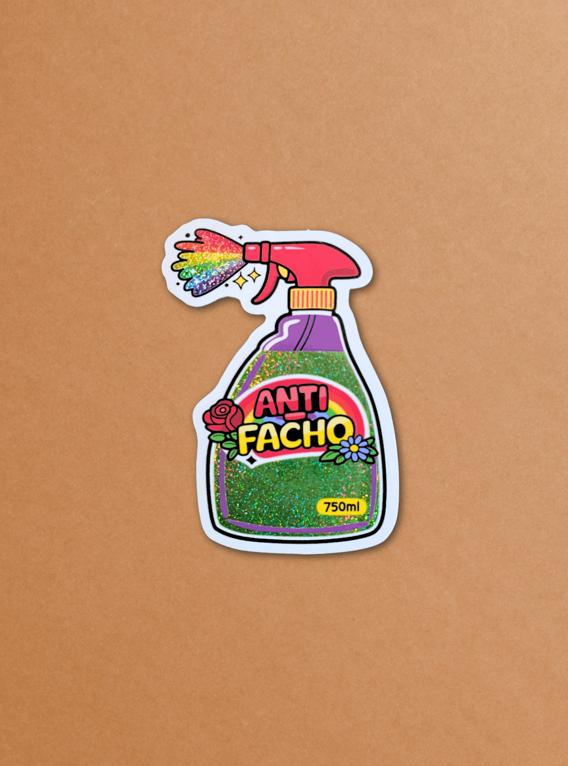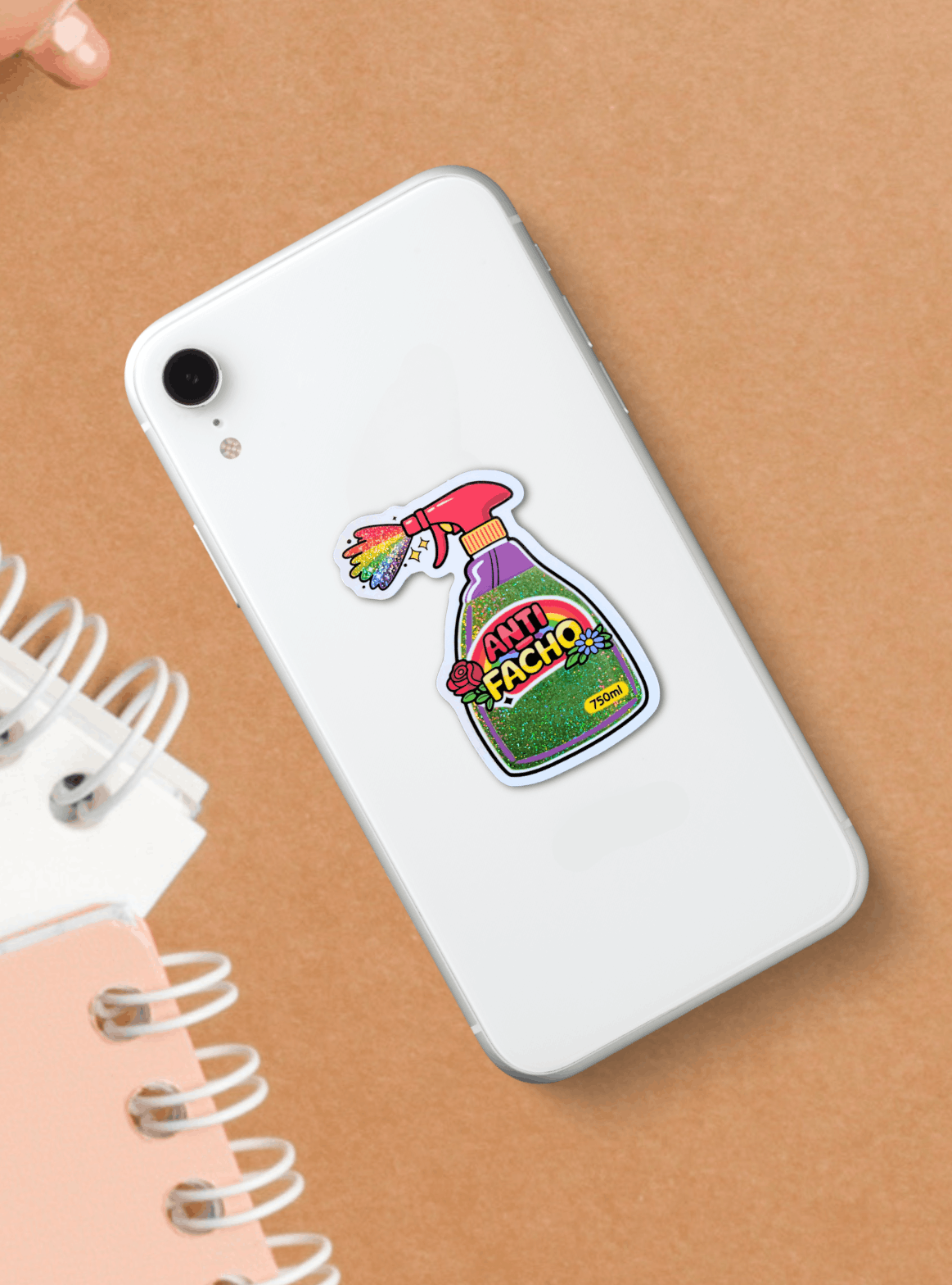 Mais ce sticker comporte une fonctionnalité supplémentaire : c’est aussi un spray anti-facho ! Il ne s’agit pas d’un spray magique, évidemment… mais d’un spray symbolique : celui qui fait grincer des dents les gens qui rêvent d’un monde où ils pourraient intimider, trier, humilier sans jamais être contredits.