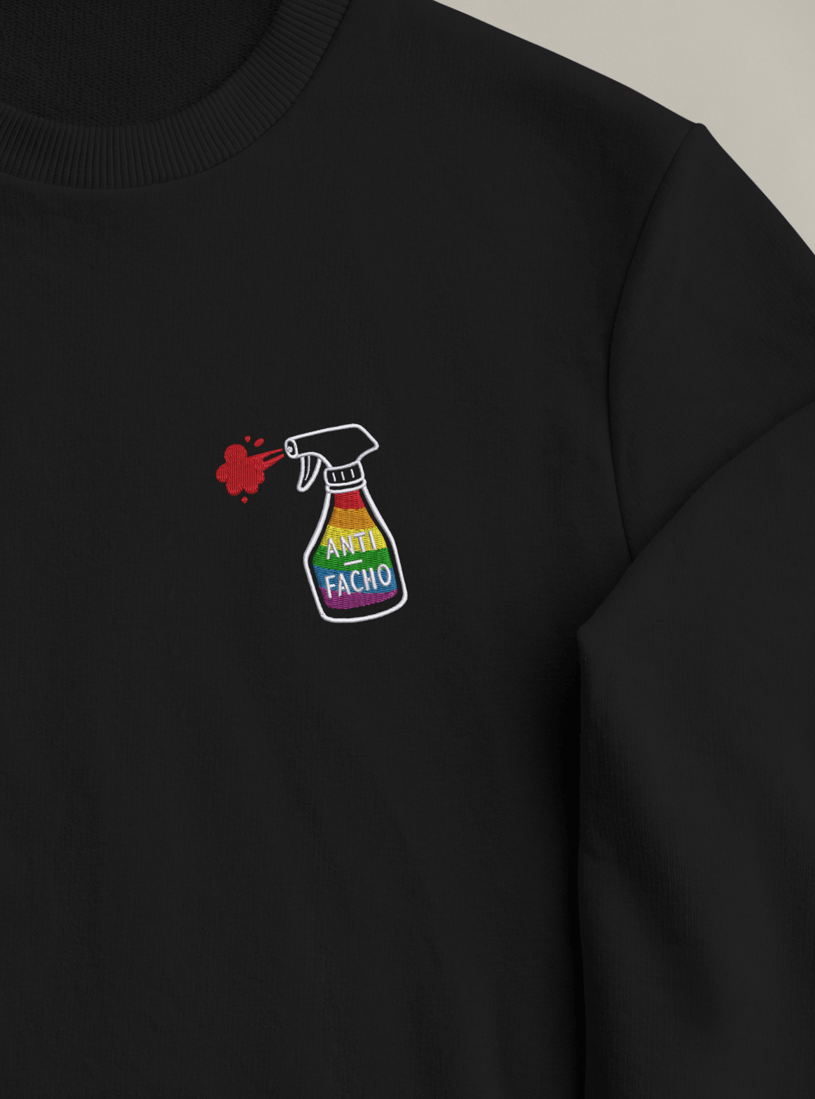 Mais ce sweat comporte une fonctionnalité supplémentaire : c’est aussi un spray anti-facho ! Il ne s’agit pas d’un spray magique, évidemment… mais d’un spray symbolique : celui qui fait grincer des dents les gens qui rêvent d’un monde où ils pourraient intimider, trier, humilier sans jamais être contredits.