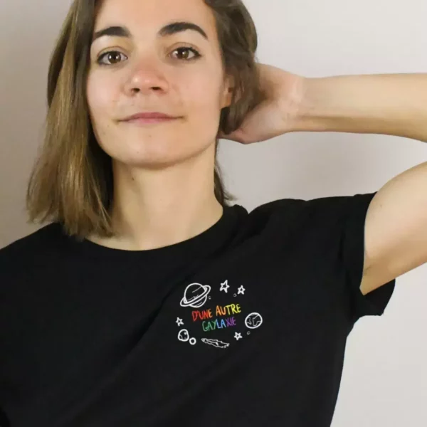 Autre exemple avec le tee shirt « d’une autre gaylaxie », qui est un simple jeu de mot : on a rendu le mot galaxie un peu plus queer !