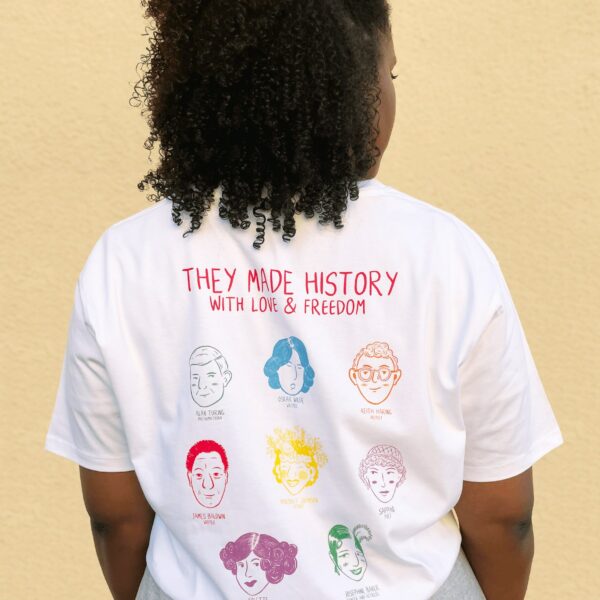 Ensuite, on a continué la sérigraphie avec notre best-seller « They made history with love & freedom » (comprenez « Iels ont écrit l’histoire avec amour et fierté »). Ici, on a voulu rendre hommage à 8 personnalités queers important·es & qui ont marqué l’histoire à leur manière.